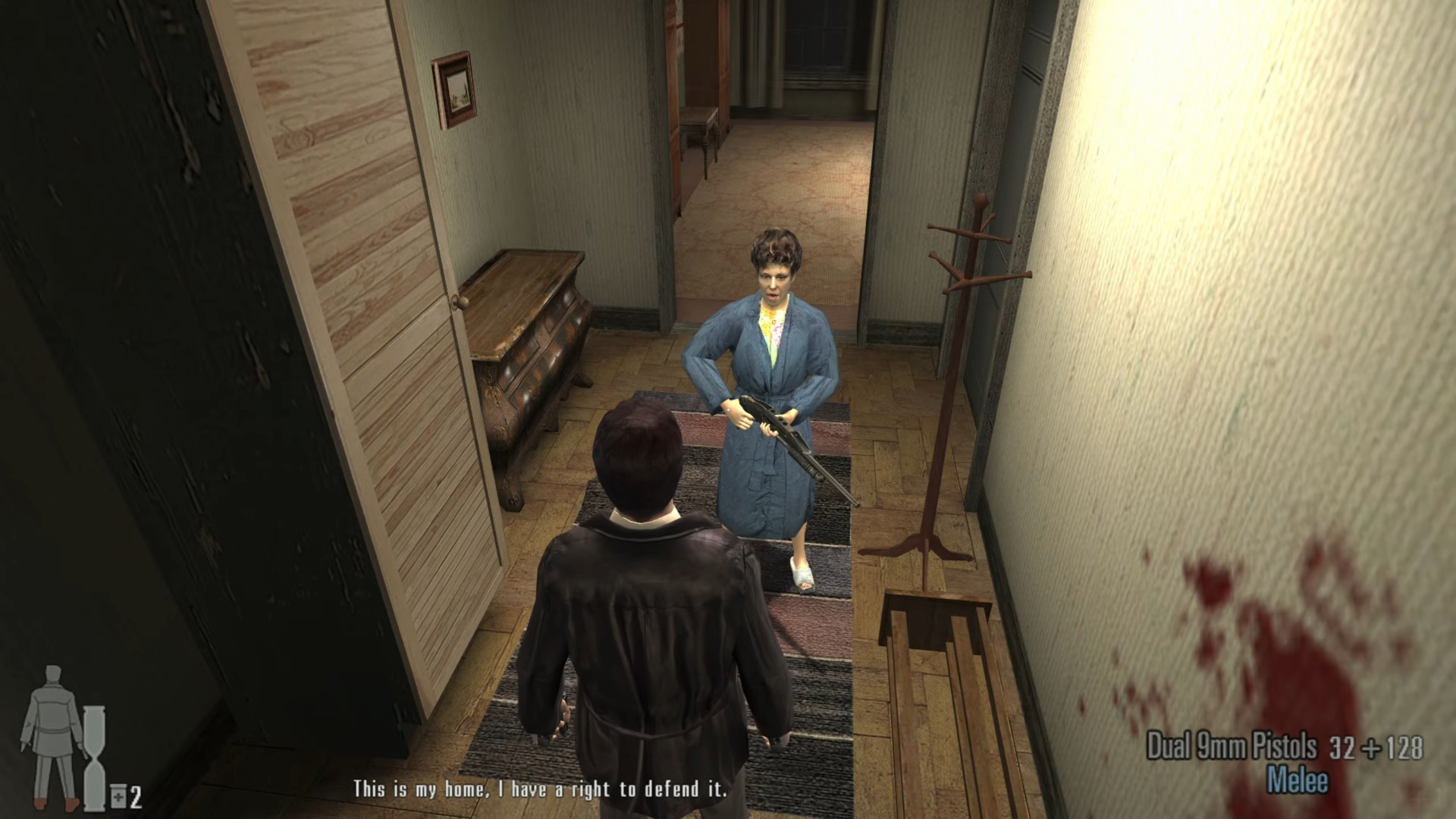 W ten sposób w grze Max Payne 2 starsza pani tłumaczyła się głównemu bohaterowi z dość ostrego „wyproszenia” jednego z wrogów strzelbą. Choć gra utrzymana była w dość mrocznym klimacie, wciąż były w niej obecne elementy czarnego humoru, od którego nie stroniła również i „jedynka”.