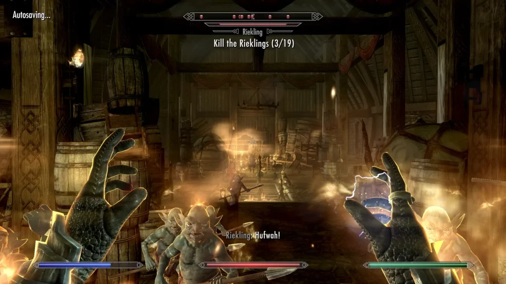 Ukończywszy prolog, skierowałem się w stronę najbliższej wioski. Po drodze natrafiłem na kopalnię pełną bandytów, a jednego z nich, strzegącego wejścia, położyłem trupem. Zwiedzanie kopalni jednak odpuściłem, gdyż kieszenie miałem wypchane przeróżnym żelastwem, które żal mi było wyrzucić. Dotarłem do wioski, sprzedałem, co miałem i wróciłem do kryjówki rozbójników. Jakież było moje zdziwienie, gdy natrafiłem tam na… ciało pokonanego przeze mnie zbója. Niby nic wielkiego, ale zwłoki w grach mają to do siebie, że znikają, nierzadko na naszych oczach. W Skyrimie – przeciwnie (*). Dodam, że pomiędzy morderstwem a powrotem do kopalni upłynęły jeden-dwa dni czasu wewnątrzgrowego.
